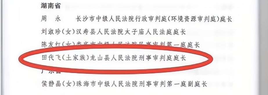 田代飞,男,1986年10月出生,土家族,中共党员,硕士研究生学历,2009年进入龙山县人民法院工作,现任龙山县人民法院审委会委员、刑事审判庭庭长。自参加工作以来,经他审结的案件无超审限,无重大改判,案件审判质量、数量和调解率连续5年在龙山法院名列前茅。因工作业绩突出,曾先后荣获“龙山县青年岗位能手”、“中共龙山县委优秀共产党员”、“县民族团结进步先进个人”、“湘西自治州青年岗位能手”、“湘西自治州法院学习型法官”、“2018年上半年市州法院办案突出个人”、“全国法院人民法庭工作先进个人”、“全国法院办案标兵”、“全国优秀法官”等荣誉称号,两次荣立个人三等功。