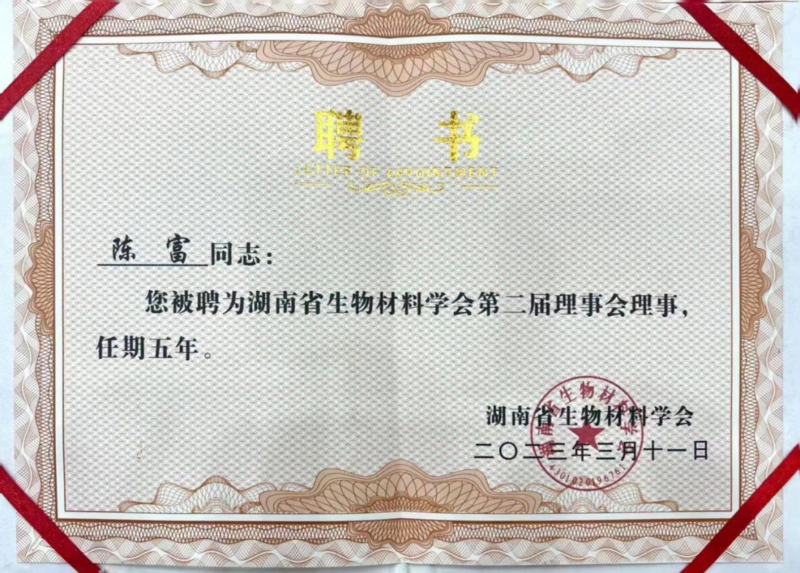 会上,我所高级合伙人陈富律师当选为湖南省生物材料学会第二届英国正版365官方网站理事。
