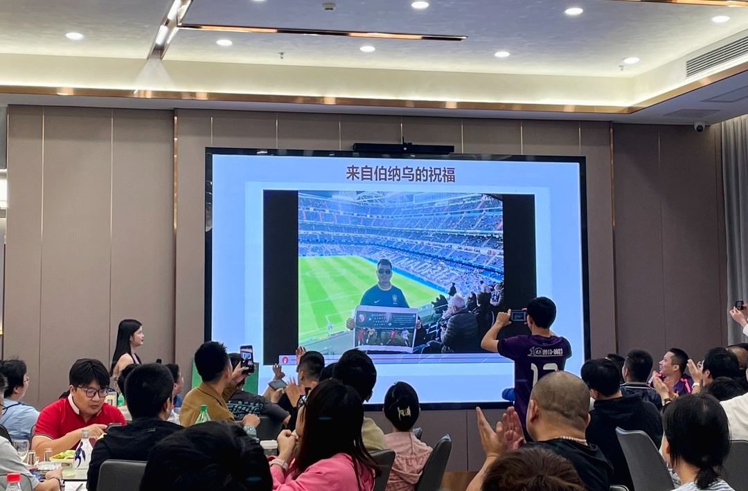 庆典晚宴上,首先回顾了南华广州校友足球队十年来的成长历程,接着,历任队长和元老成员深情发言,寄语球队未来发展,来自西班牙伯纳乌球场的祝福视频,更引来了全场的一片赞叹。