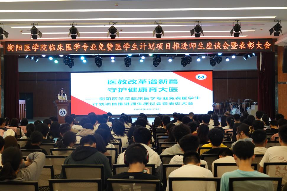 为进一步发挥临床医学专业免费医学生计划项目的示范带动和牵引作用,表彰优秀学生,3月31日上午,衡阳医学院临床医学专业免费医学生计划项目推进师生座谈会暨表彰大会在求是园大学生活动中心举行。宣传部常务副部长代艳丽、学工部部长李照、教育发展与校友联络办主任李先国、教务部副部长蒲成志、校团委副书记禹敏,衡阳医学院党委书记曾国、常务副院长屈顺林、党委副书记卢清华、副院长周洲,基础医学院副院长谢巍,公共卫生学院党委副书记王超,以及衡阳医学院全体辅导员、教务办全体教师、班主任代表、临床大类学生代表300余人参加大会。大会由2020级E+x班学生何子怡主持。