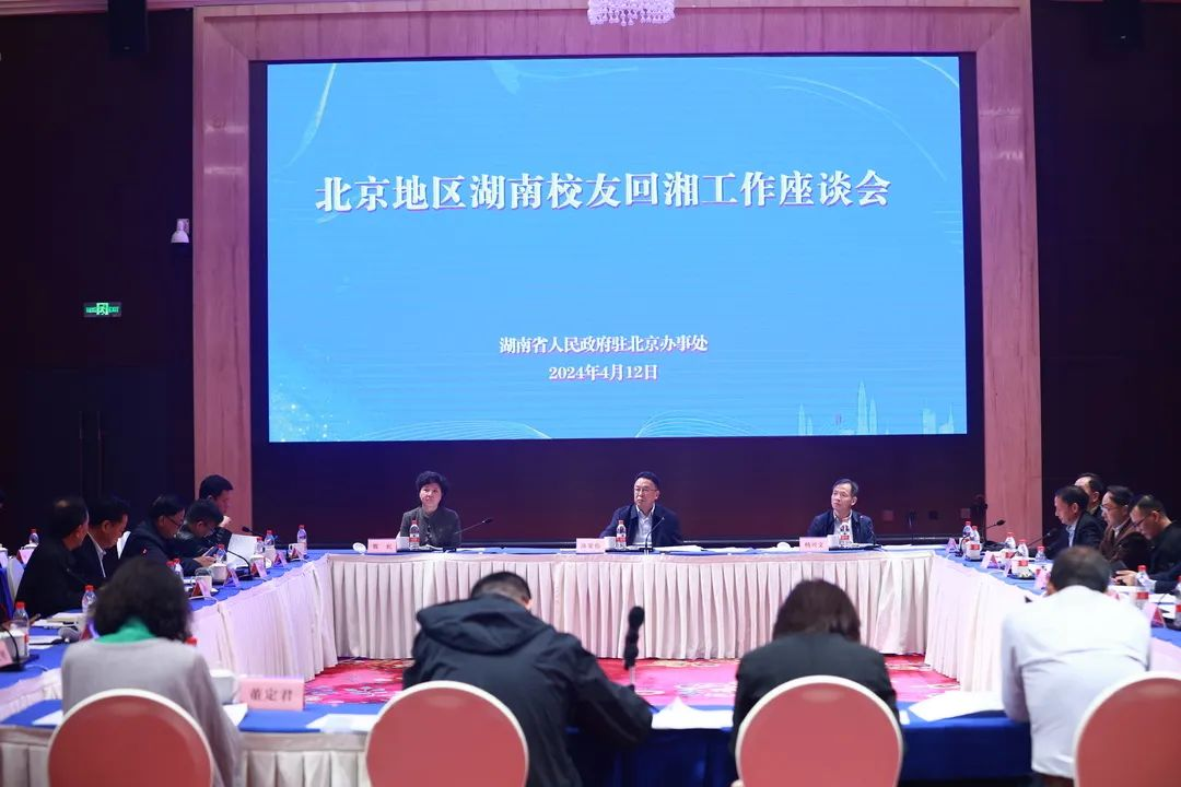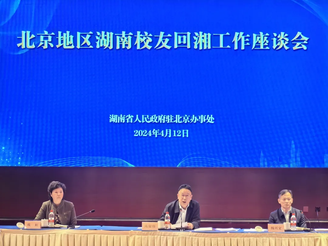 4月12日,北京地区湖南校友回湘工作座谈会在京召开。湖南省政府驻北京办事处党组书记、主任陈荣伟出席会议并讲话,党组成员、副主任杨兴文主持会议。