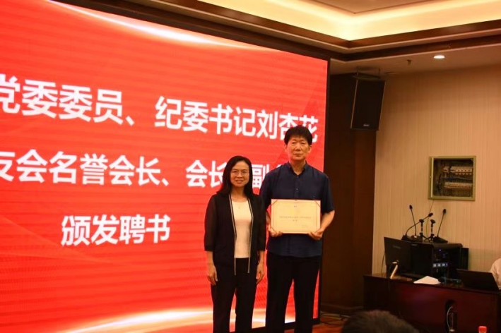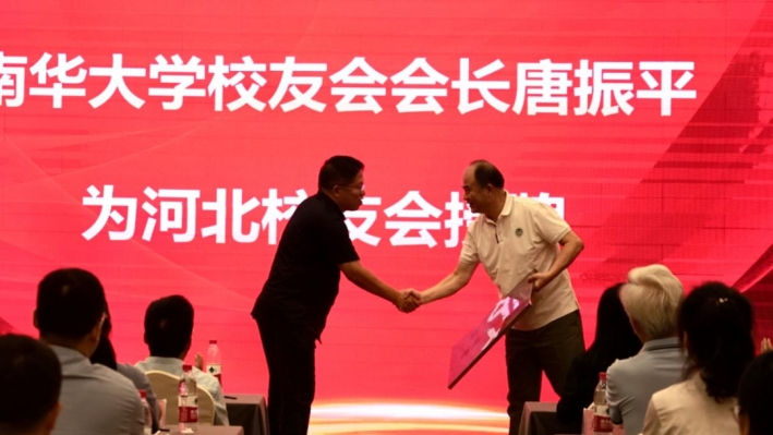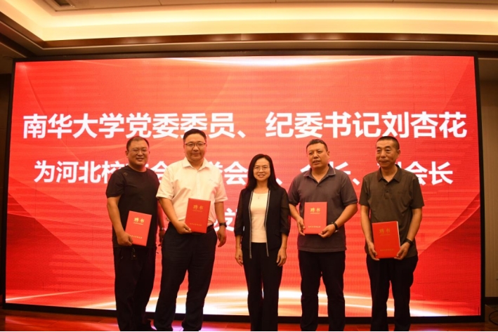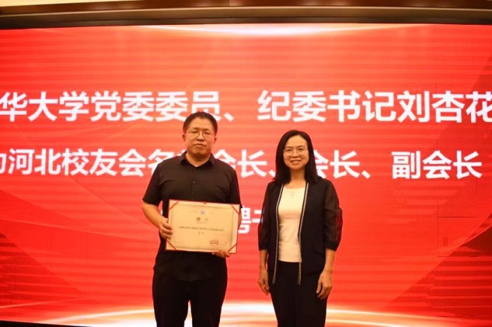 唐振平为河北校友会授牌,刘杏花为河北校友会名誉会长、会长、副会长颁发聘书。
