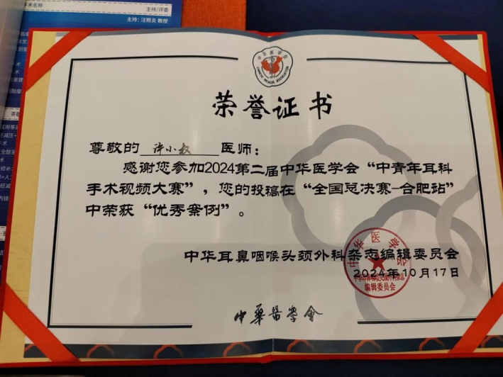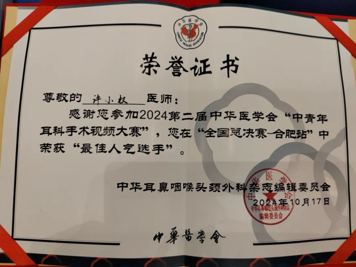 在10月20日结束的2024第二届中华医学会“中青年耳科手术视频大赛”全国总决赛中,区陈家桥医院耳鼻咽喉头颈外科许小权副主任医师凭借其精湛的技术和出色表现,成功捧回手术视频三等奖和最佳人气奖。