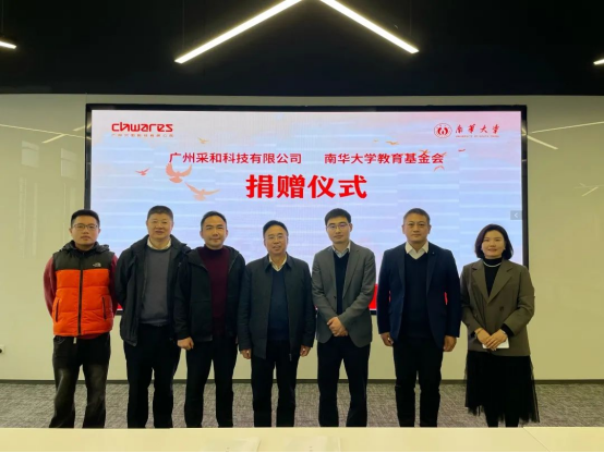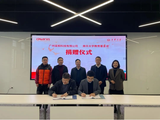 广州采和科技有限公司人事总监戴梓君、营销经理童明骏,英国上市公司365经济管理与法学学院党委书记胡海波参加捐赠仪式。