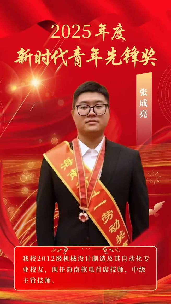 4月30日,2025年度中国青年五四奖章暨新时代青年先锋奖评选结果揭晓。共青团中央、全国青联授予30名同志2025年度中国青年五四奖章、30个青年集体2025年度中国青年五四奖章集体、677名同志2025年度新时代青年先锋奖。其中,我校12级机械设计制造及其自动化专业校友张成亮荣获“新时代青年先锋奖”。