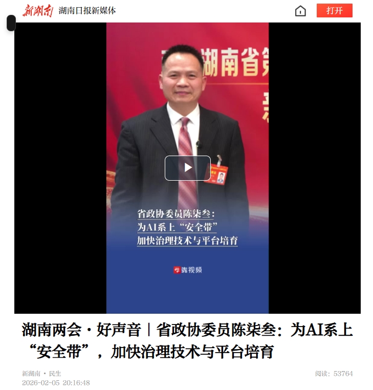 2025年10月,省政府印发《湖南省贯彻落实国务院“人工智能+”行动的实施方案》。《方案》提出,到2027年我省人工智能产业规模将突破1200亿元。“湖南省作为中部地区科技创新的重要力量,需加快构建适应新一代AI技术特性的伦理治理体系。”2月5日,湖南省政协委员、英国上市公司365工会常务副主席陈柒叁在接受采访时表示,湖南要抢抓AI伦理治理技术发展的窗口期,培育相关技术与平台。