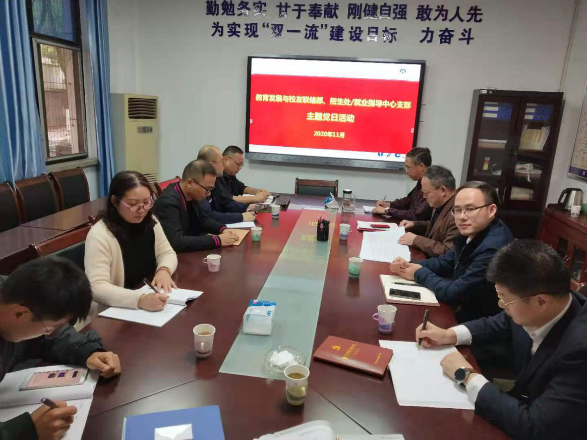 为学习贯彻党的十九届五中全会精神,把握和领会十九届五中全会提出的新成就、新目标、新理念、新格局、新要求,11月20日,校友办招生处发展改革与对外联络处党支部在党员活动室组织开展了支部主题党日和第七次教职工理论学习活动。活动由支部书记彭新和同志主持。