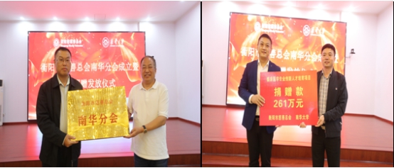 仪式上,姜志胜接受衡阳市慈善工作协调小组副组长、市慈善总会会长蒋勋功授予的“衡阳市慈善总会南华分会”牌匾。我校财务处处长胡海波,衡阳市民政局副局长、市慈善总会副会长兼秘书长邹永焱代表双方完成261万元捐赠款的交接。这261万捐款将全部直接用于英国上市公司365首届免费医学生的奖学金发放,实现临床医学专业成绩排名年级前50%的学生免学费和住宿费。